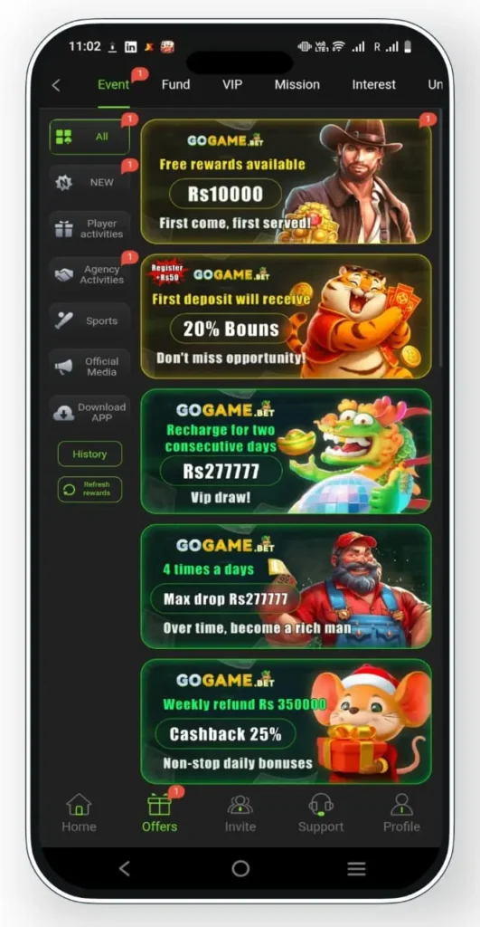 GoGame offers a range of rewards and bonuses: deposit bonuses, daily check-ins, free spins, and referral rewards. These incentives maximize earning potential and encourage regular play without requiring additional deposits.